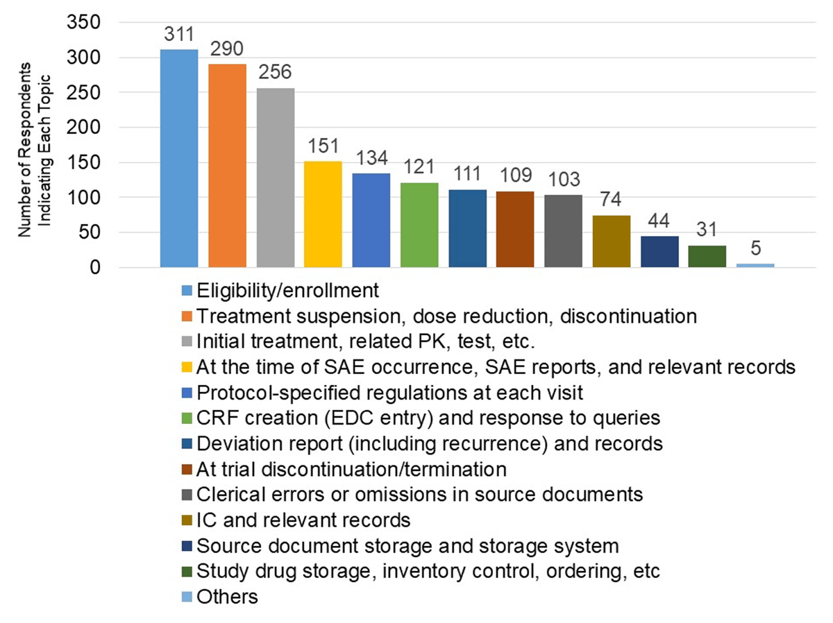 The 375 respondents indicating that they participated in monitoring as part of their job responsibilities, i.e., they respond to monitoring by CRAs, were asked to state areas with a high risk of errors and that should be included in monitoring. The most frequently listed area, “eligibility/enrollment”, was stated by 311 (83%) of the respondents. Two hundred and ninety (77%) of the respondents indicated some aspect of or directly stated, “treatment suspension/dose reduction/discontinuation”, Two hundred and fifty-six (68%) of the respondents indicated some aspect of or directly stated, “initial treatment, PK and related tests, etc.” (Figure 3).
