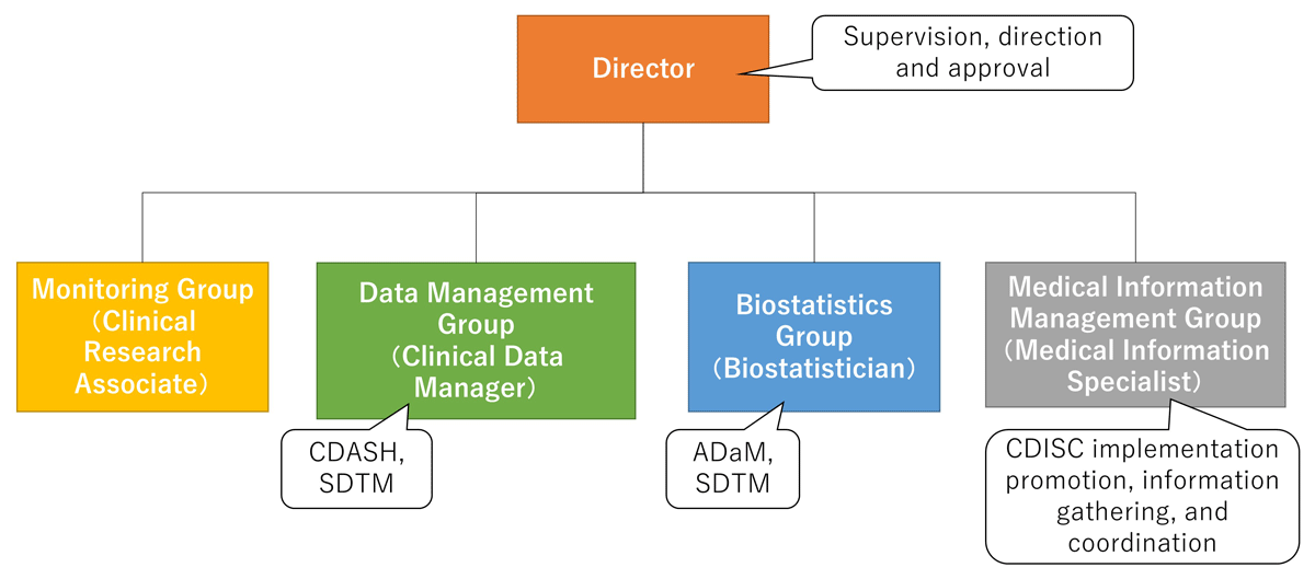 Figure 1 shows our Data Center structure and CDISC roles: Data Management Group, creation of CRFs considering Clinical Data Acquisition Standards Harmonization (CDASH)7 and SDTM, creation of SDTM; for Biostatistics Group, creation of ADaM; in Medical Information Management Group, one lead CDISC staff member is assigned to promote the introduction of CDISC and collect information.