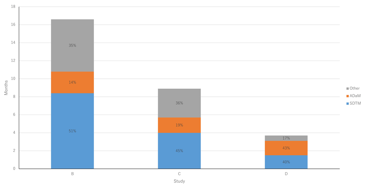 As results of Study B, C and D—our in-house production—we calculated the time required for CDISC compliance work from the daily work hour records. In Study B, the total work time for all staff members was 16.6 months. In Study C, the total time required for the entire work was 8.8 months, and in Study D the figure was 3.7 months. This indicates a significant reduction in work time (see Figure 2).