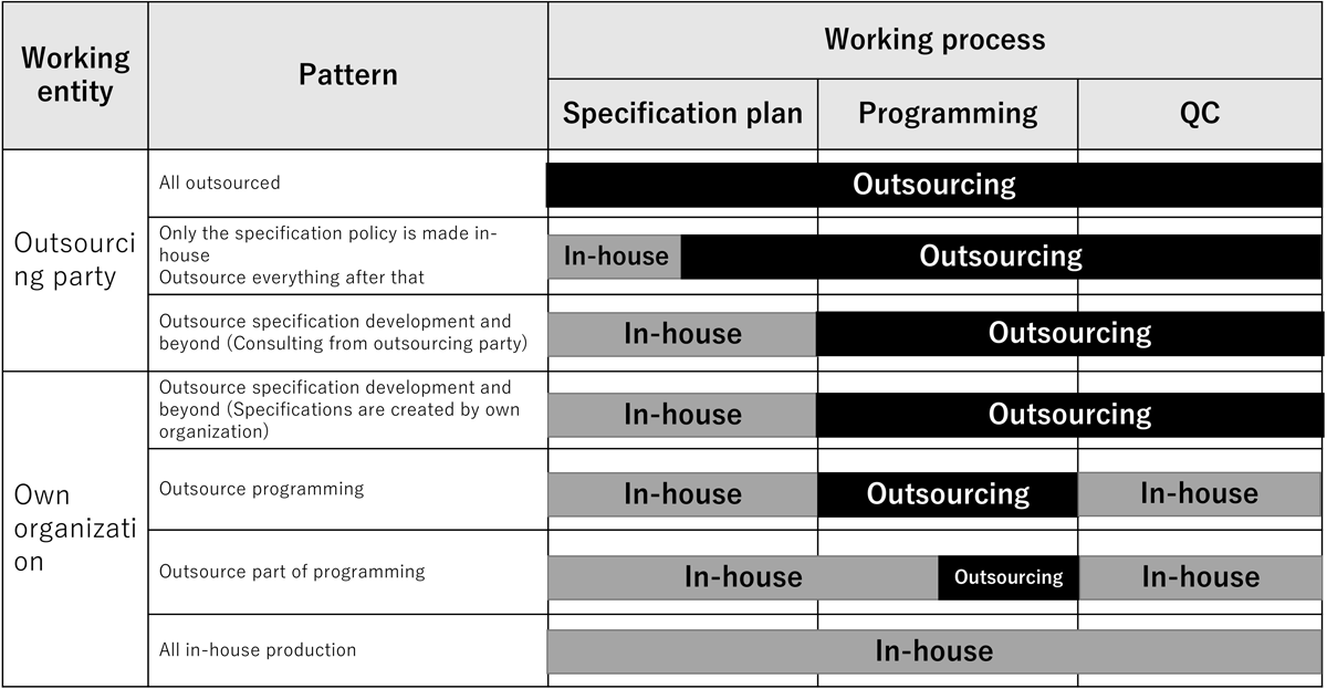 When outsourcing, SDTM and ADaM specifications are often subject to change due to CRF revisions by protocol amendments and the content of the data entered. Consequently, it is necessary that the contract is flexible, such as allowing for an extended period according to the period of study, and including clauses that cover the impact of potential specification changes. Prior confirmation of deliverables to be delivered is also necessary. When outsourcing work to an external contractor as the work entity, the skills and experience required to take the lead should also be confirmed as requirements at the time of outsourcing.